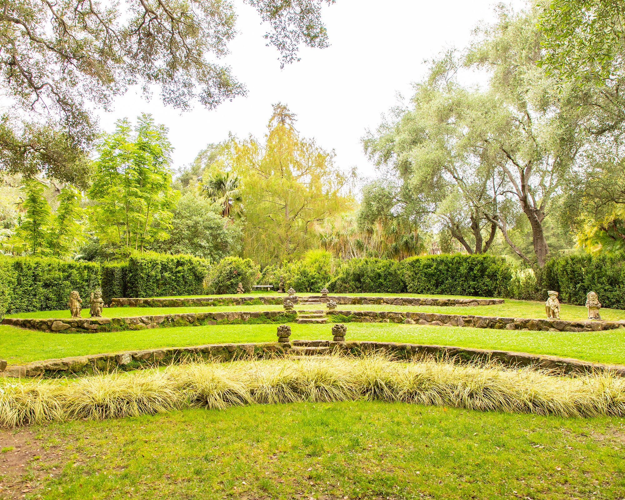 It was Walska, too, who had spearheaded the creation of this explosive rose garden, the “blue garden” (so called for its blue grasses, atlas cedars, blue brahea fan palms, and agaves), the two separate orchards with more than a hundred deciduous and citrus trees, the topiaries and the shade palms and succulents, and even the Jurassic-looking Cycads, where you can find, thriving, some of the rarest and most hotly desired plants on the planet. (I’ve never quite understood the Cycad obsession myself, but it is real. And excitingly for the evidently ample cycad enthusiasts out there, the property has at least 450 specimens, almost half of the known species left in the world; five species on view are believed to be extinct in the wild.) It was this mysterious Walska, as well, who had enlisted such unorthodox garden decor as chunks of colored glass from the California-based Arrowhead water company, as well as gems and minerals and giant clam shells and small mythological statues to appear in the landscape. Amidst all the natural and expertly, expensively cultivated splendor was a sense of humor, is what I’m saying. My kind of gardener.