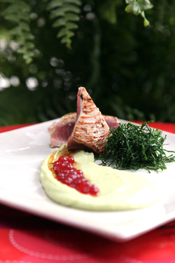 Zazá’s go-to dinner party dish: Tuna in smashed potatoes, with wasabi and beetroot pearls