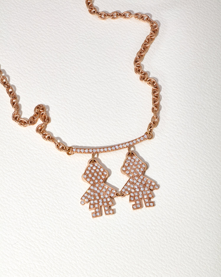 The collection also includes individual white diamond pavé Baby Girl and Baby Boy pendants — meant to be worn with Rollò chains, Discoball, FORTE Beads or Lucky necklaces.