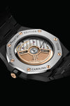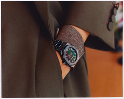 That explains why her latest design for the Swiss watchmaker, the ceramic Royal Oak Selfwinding Carolina Bucci Limited Edition, has not an ounce of frosted gold. Instead, the pièce-de-résistance is a cool and futuristic, holographic dial that, at first glance, looks black, to match the black ceramic case and bracelet. But a flick of the wrist then reveals the house’s Tapisserie signature, shining through in iridescent hues that vary depending on how light hits the watch.