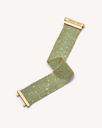 This bracelet is woven from threads of 18k Gold and silk in the colour of your choice. It is 2cm wide and will be made-to-measure to your desired wrist size.