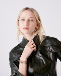 This Lucky bracelet features an 18k yellow or white gold diamond-cut chain, hand-braided with beige silk and finished with a peace sign charm.