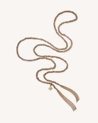 It is approximately 95cm, including 4.5cm long tassels on either end. Meant to be worn alone or layered — as a necklace or a wrap bracelet — with one of our pendants or 1885 Links.