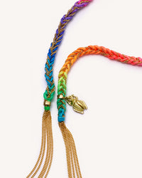 This Lucky bracelet features an 18k gold diamond-cut chain, hand-braided with neon silk and finished with a scarab charm symbolising Strength.