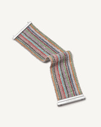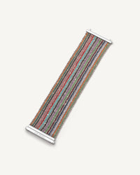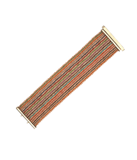 This bracelet is woven from threads of 18k white or yellow gold and Rainbow silk in a striped pattern. It is 4cm wide and will be made-to-measure to your desired wrist size.