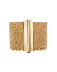 This bracelet is made from threads of 18k yellow and white gold woven on a centuries-old Florentine loom. It features a row of white diamonds on its 18k yellow gold clasp.