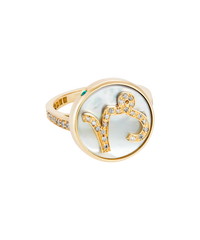 Crafted from 18k Gold, this ring features a Zodiac symbol in pavé grey diamonds on a mother of pearl medallion.