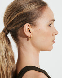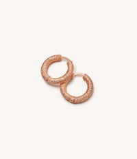 A pair of round huggy earrings with a hook closure, made from 18k gold in our signature Florentine Finish.