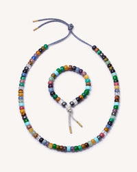 Our FORTE Beads necklace and bracelet kit comes with 84 vibrant hard-stone beads in preset Moonbow colours, two Florentine Finish 18k gold beads, a bracelet cord and a necklace cord in the colour of your choice.