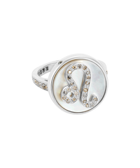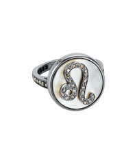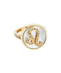 Crafted from 18k Gold, this ring features a Zodiac symbol in pavé grey diamonds on a mother of pearl medallion.