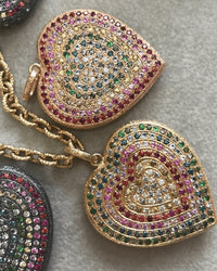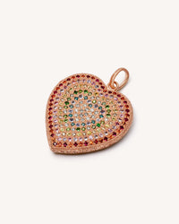 A heart-shaped pendant in 18k Gold with pavé sapphires and diamonds in a vibrant Rainbow colour combination. The pendant is reversible and features our signature Florentine Finish on the other side. It is approximately 3.6cm tall and features a classic Carolina Bucci link.