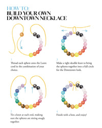 The Downtown necklace is designed to be worn as a kind of loose choker... up close to the wearer’s face, where the colours can reflect one’s individuality. We recommend tying a knot at each end of the spheres, making sure they are sitting snugly together, before securing your necklace with a tight double knot.