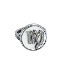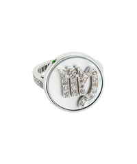 Crafted from 18k Gold, this ring features a Zodiac symbol in pavé grey diamonds on a mother of pearl medallion.