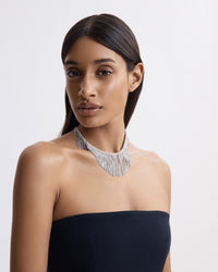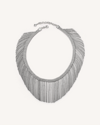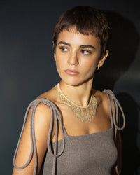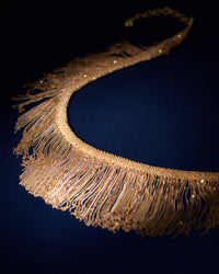 This delicate and feminine fringe necklace is made of part-woven 18k gold threads. It features an adjustable chain.
